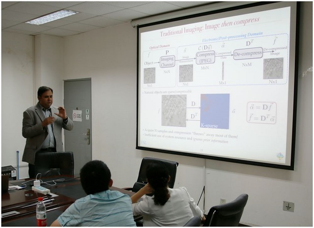 报告中,Ashok教授主要介绍了其课题组在计算成像方面的最新研究内容。报告首先采用量子信息理论方法讨论了成像系统的极限分辨率。在此基础上,通过在探测器前加入场调制器,改进成像系统分辨率。报告的第二部分主要针对压缩成像系统测量矩阵的设计进行介绍。将信息理论应用到矩阵设计中,从而提高系统的图像恢复效果。