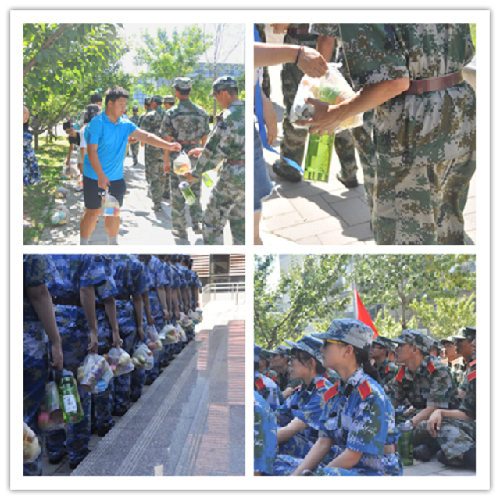 同学们依次领取了慰问品,感受到了来自学院的温暖,笑容洋溢在脸上,并以响亮整齐的歌声展示出了他们对军训和大学生活的必胜信心。
