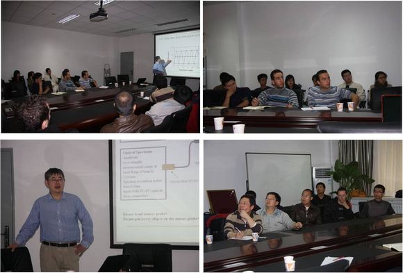 2011年10月28日南京航空航天大学前教授,美国布朗(Brown)大学访问副教授,波士顿(Boston)大学副教授,美国FLT公司副总裁、技术总监骆飞博士应邀来我院做学术讲座,与江毅教授课题组进行了学术交流。骆飞博士长期从事光纤传感器、光纤无源器件、光纤激光器的研究工作。重点做了2个学术报告:“光纤高温温度传感器”和“光纤激光器”。会后也与在场学生进行了热烈的学术讨论与交流。