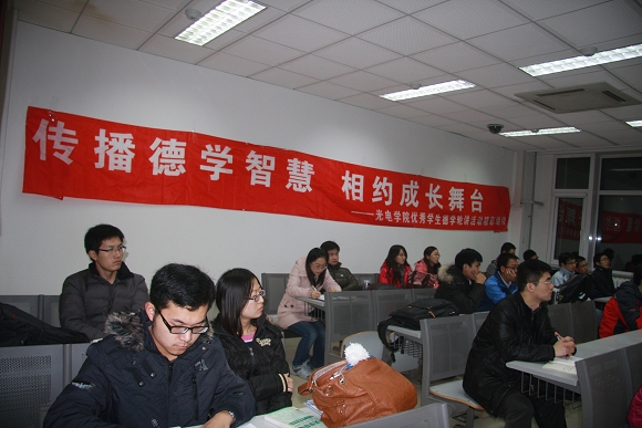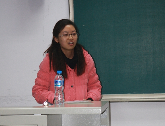 获得西安应用光学奖学金的硕士三年级学姐唐秋艳就自己的学习生活从四个方面与同学们进行了分享。一是成功与失败的关系,她提出我们要以正确的心态来面对我们遇到的顺境与逆境;二是科研方法,要始终坚持好独立与合作的关系,其中合作以独立为前提,而独立以刻苦为前提;三是把握与放弃的关系,她给大家讲述了扛着树过悬崖的故事,这个生动形象的例子让大家明白了在科研道路中的取与舍,并提出要想“outstanding”,必先“stand out”;四是身体与心态,这也是成功的一个必不可少的条件。