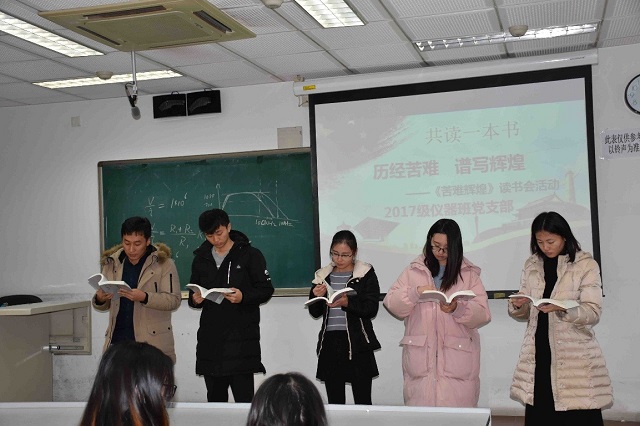 《苦难辉煌》一书,全方位详细讲述了中国共产党的诞生与发展,直至辉煌。许多历史的真实性在书中重新再现,使读者更加了解了我们的党,是历经血雨风霜,坚韧地为理想,为人民,无数革命先烈抛头颅,义无反顾地前仆后继,舍生忘死地奋斗,展现出了近代史一部波澜壮阔的革命画卷。仪器班党支部将读书会扩大到全班同学中,分小组选取经典片段齐声诵读,深入了解老一辈先烈们不惧艰难险阻,甘为共产主义事业与人民解放事业抛头颅、洒热血的牺牲精神。