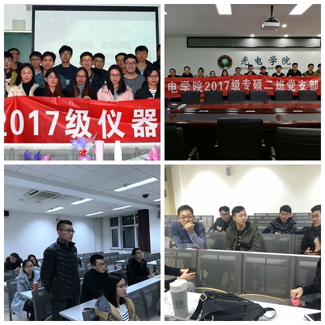 物电班党支部、光工2班党支部组织全体党员、积极分子集体学习《苦难辉煌》,分享读书心得,汲取精神营养,不忘初心,继续前行。专硕1班党支部、专硕2班党支部开展“学苦难、铸辉煌”党日活动,交流研读《苦难辉煌》心得体会。党员张晋源说,每一位伟大之人都会经历磨难,所谓吃得苦中苦,方为人上人。习总书记当年在陕北插队,深入基层,与农民同甘苦共患难,也正是因为这段经历,才使得如今的打赢扶贫攻坚战,进行精准扶贫更加深入透彻。积极分子崇泽辉发言:“一个人要有正确的理想,要有为人民服务的意识,更要有坚持自己理想信念的勇气和毅力”。党员王文彬表态:“人活一辈子要有热情、有理想,有追求,我要踏踏实实埋头苦干、献身科研,争取做个实干家。”