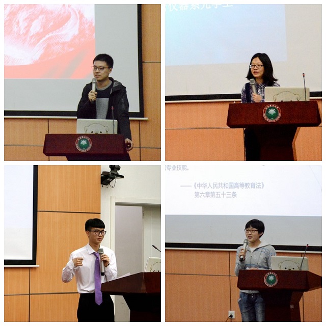 最后,盛筠发表感言,她首先对获奖的同学表示祝贺,并通过两个小故事,鼓励后进的同学们从现在开始,突破自我,迎难而上,争取先进;要求获奖的同学要戒骄戒躁,向着更高目标和平台,继续发挥领跑作用。她还感言在党的领导下,中国在政治、经济、文化、社会和生态文明建设方面取得了举世瞩目的伟大成就,同学们更应该珍惜当前美好时代,牢固树立“四个自信”,志存高远,牢记使命,为实现自我发展,为祖国繁荣富强而不懈努力奋斗。