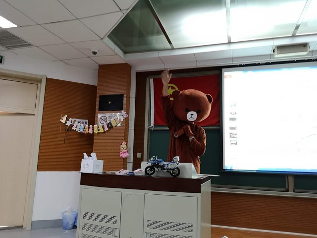 主持人身穿小熊外衣在大家的掌声中登上了讲台,由班级成员们的童年照剪辑成的视频和集体活动的种种合影回忆了家相识近一年来的有趣经历。