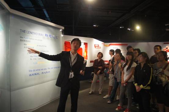 同学们在联想总部(北京)的展览室里聆听工作人员讲述联想创业历史