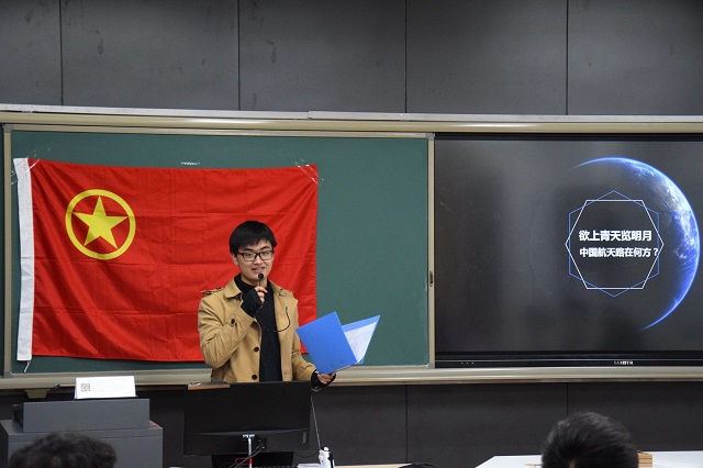 活动伊始,时昊同学为本支部同学生动介绍了 “中国航天日”的由来,以及中国航天事业从摸索起步到自主研发的艰苦奋斗历程,并由数据资料,从政策、资金、舆情等多角度分析对比当今中美航天科技水平,最后对中国航天未来进行了简要展望,进一步加深了同学们对“中国航天日”以及“中国梦”“航天梦”的认识与感悟。