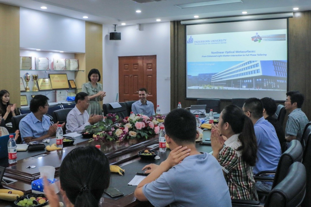 2019年8月20日上午9:00,德国帕德博恩大学Thomas Zentgraf教授应邀到yl7703永利官网,进行了题为“Nonlinear Optical Metasurfaces: From Enhanced Light-Matter-Interaction to Full Phase Tailoring”的学术报告。讲座由黄玲玲教授主持,来自本校yl7703永利官网及物理学院、北京大学及清华大学等兄弟院校的老师和同学出席,包括王涌天教授、刘娟教授、李家方教授、崔岩岩特别副研究员、李昕特别副研究员、北大马仁敏老师等。