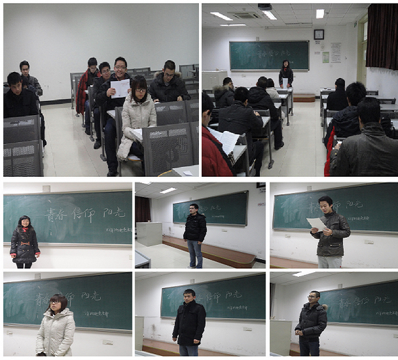 2012年11月27日,12级硕士物电支部在理工校园里,召开了一次“信仰·青春·阳光”交流活动。经过研一快半个学期的学习生涯,同学们之间建立了深厚的情谊,同时,大家也都有各自不同的经历和感悟,应同学们强烈倡议,本团支部将大家召集在一起,召开交流会,让同学们自主上台发言,和大家分享自己的感悟,分享自己经历的精彩片段。同时,同学们也将各自研究生期间的困惑在交流会上说出来,大家一起帮着解答。分享是快乐的,青春本身就应该充满快乐。