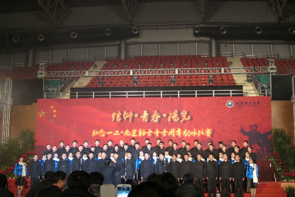 阳光的心态,心怀梦想、积极向上。 “一二·九歌咏比赛”将同学们凝聚到一起,每一个集训的日子都是一次精神洗礼,同学们在歌声中高举旗帜,在歌声中追寻梦想,在歌声中努力共同创造集体的荣誉。