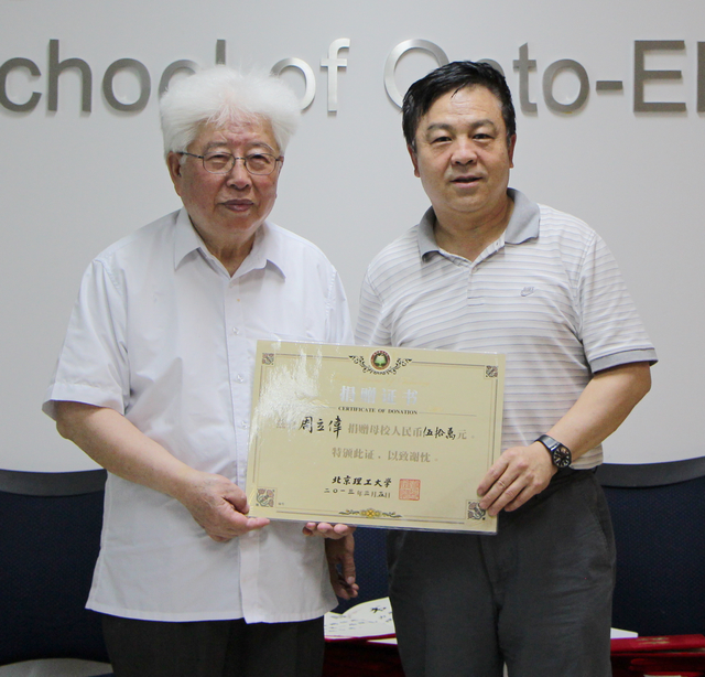 会议宣布周立伟奖助学基金第一届理事会成立,它由yl7703永利官网及基础教育学院教授和领导组成。理事会聘任周立伟、倪国强、薛唯、郝群、邹锐、王涌天、李艳秋、赵维谦、金伟其、高春清、赵跃进、王悦音、张青山、丛磊为理事;周立伟任理事长,倪国强、郝群、王悦音任副理事长,倪国强兼任秘书长,周霞任秘书。杨宾副校长向各位理事发放了聘书,向周立伟院士颁发了捐赠证书。