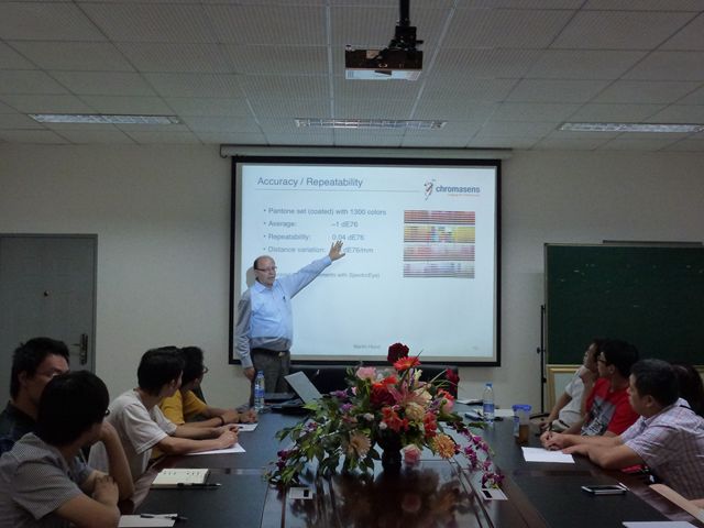 此次学术交流的主题主要侧重于采用数码相机的多通道光谱成像技术,即通过图像采集设备在可见光范围内采集拍摄现场的几个或多个通道光谱信息,通过相应的算法重建其光谱反射比,进而实现颜色信息的准确复制。多光谱颜色技术最早由德国的亚琛工业大学提出,其研究发展主要集中在2个方面:图像采集系统硬件设计的改进和光谱反射比重建技术理论研究。目前,多光谱成像技术在颜色科学领域的发展已经被广泛应用;如采用数码相机的多通道光谱技术进行实时印刷品的颜色失真监测;或采用光谱重建技术来重建油画光谱反射比,并以此作为建立数字博物馆的电子文档数据等等。Markus Schnitzlein 先生主要介绍了这一技术的硬件设施的研究发展及最新技术,并就提出的问题进行了相关的讨论。