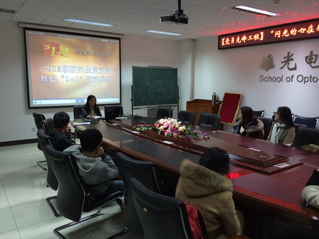 为响应学校党员先锋工程工作要求,深入开展学生党员理论学习实践活动,2014年11月17日晚,学院分团委举办了“闪光的心在行动”——红色1+1成果交流会。交流会由13级硕士研究生党支部书记张逸辰主讲,11级全体党员骨干参加了会议。