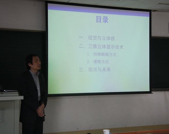 谭博士主要从立体显示技术、光学全息存储技术和研究的现状与未来等三个方面进行了报告。首先,他介绍了视觉与立体感的关系,并从心理学的角度讲解了其中的原因。随后,他以当下热门的3D电影以及等离子电视等为例对特殊眼睛及裸眼方式的三维立体显示技术做了详细介绍。现场提问阶段,老师和同学们积极踊跃提问,谭博士都一一给予了行耐心细致的解答。