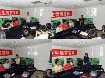 大家早早来到会场,进行布置。答辩会上,饱含热情。这次德育答辩是一次很难得的聚会,大家把德育论文当作自己对大学四年的梳理和反思,把答辩交流视为和老师真情话别共叙情谊的过程。所以,大家都很珍惜这次机会,畅谈理想和未来的人生目标,回忆过去大学四年在学校生活的点点滴滴。