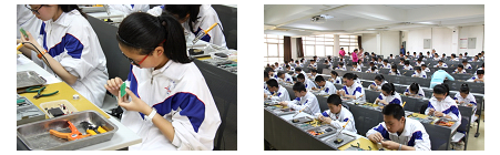 在为时两个半小时的科技实践课程中,光电创新基地张丽君等三位教师严密组织,认真授课、悉心指导,学生严肃认真,遵守纪律,听从指挥。这些学生学习了工具的使用,认识了基本元器件,掌握了电子工艺装配方法,最终全部成功完成了自己的实践作品。
