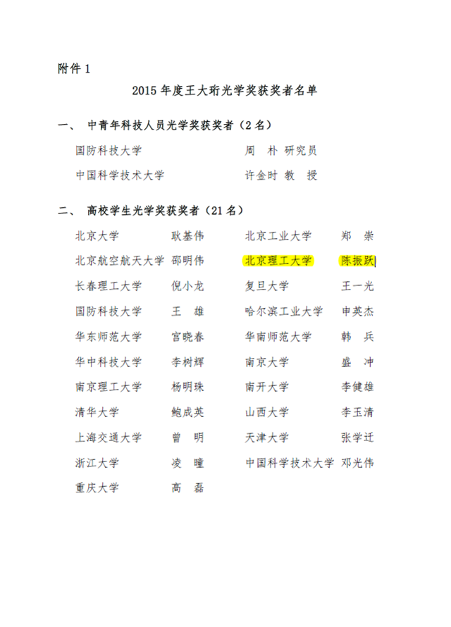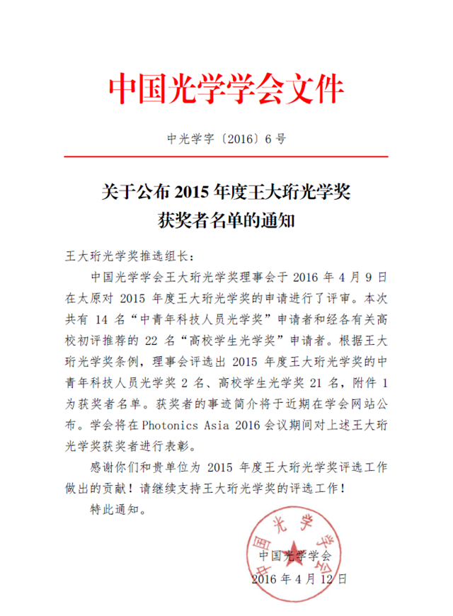 中国光学学会王大珩光学奖理事会于2016年4月9日在太原对2015年度王大珩光学奖的申请进行了评审。根据王大珩光学奖条例,理事会评选出2015年度王大珩光学奖的中青年科技人员光学奖2名、高校学生光学奖21名。