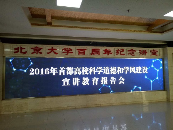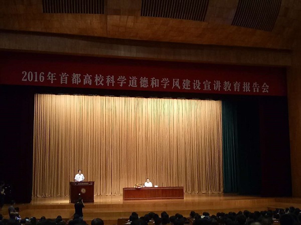 2016年 9月20日下午,2016首都高校科学道德和学风建设宣讲教育报告会在北京大学百周年纪念讲堂召开。本次报告会由全国科学道德和学风建设宣讲教育领导小组与北京市科学道德和学风建设宣讲教育领导小组主办,由北京大学承办,北京市各所高校的研究生代表参加。