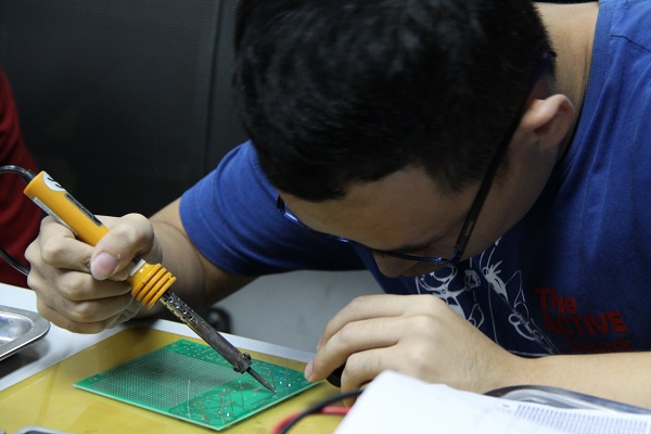 讲解结束后,基地指导老师引导同学按次序领取实验器材,并逐一介绍各类工具的使用方法。因为是第一次实验课的缘故,几位老师极为耐心地带领同学从头焊接电路,随时为有困难的同学提供帮助。完成焊接后,老师也预留了充分的时间供大家检验电路,在调试电路的间隙,老师还教授了检查电路失误之处的技巧。在老师热心的帮助,和同学们不懈的努力下,所有同学都焊接出令自己满意的电路成品。