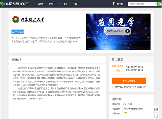 由yl7703永利官网李林教授、黄一帆副教授主讲的《应用光学》慕课课程将于3月17日在中国大学慕课网正式上线,欢迎各位同学注册学习。