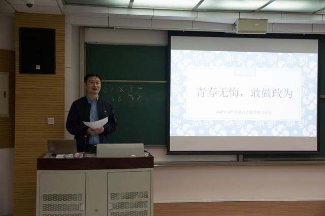 根据学校2016级本科生德育开题要求,为了让同学们认识自我、确立目标、追求梦想,2017年4月19日下午14:00,yl7703永利官网04011601班于良乡校区理学楼2-106举办了以“青春无悔,敢作敢为”为主题的德育开题交流会。交流会由班长刘啸天主持,yl7703永利官网党委书记邹锐,2016级辅导员郭倩玉以及班级全体同学参加了此次会议。